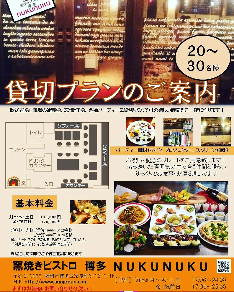 窯焼きビストロ 博多NUKU NUKUは皆様の思い出に残る宴会のお手伝いをさせて頂きます❗