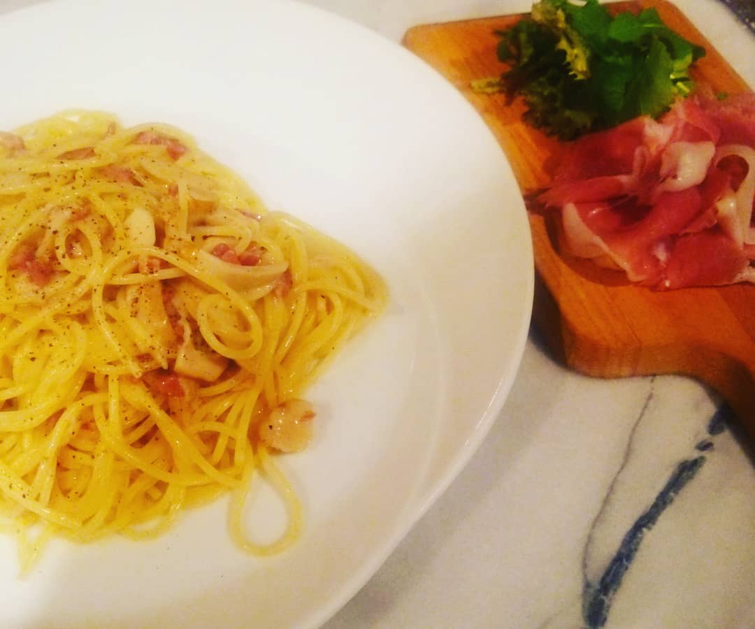 パスタの熱で生ハムにじんわりと火が入り良い感じです(*´ω`*) 土曜日はパスタ