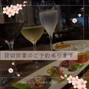 いつもご利用いただき、 ありがとうございます。 送別会、歓迎会のシーズンですね! 当店では団体様、 貸切営業のご予約を 随時承っております! お世話になった方、 新しく迎える方を温かく迎える会を 是非、 窯焼きビストロ博多NUKUNUKUで! ご予算,人数等 お気軽に お問い合わせ下さい! また、プロジェクターや、 メッセージプレート、 花束準備等も承ります♫ 皆様のご来店心よりお待ちしております。