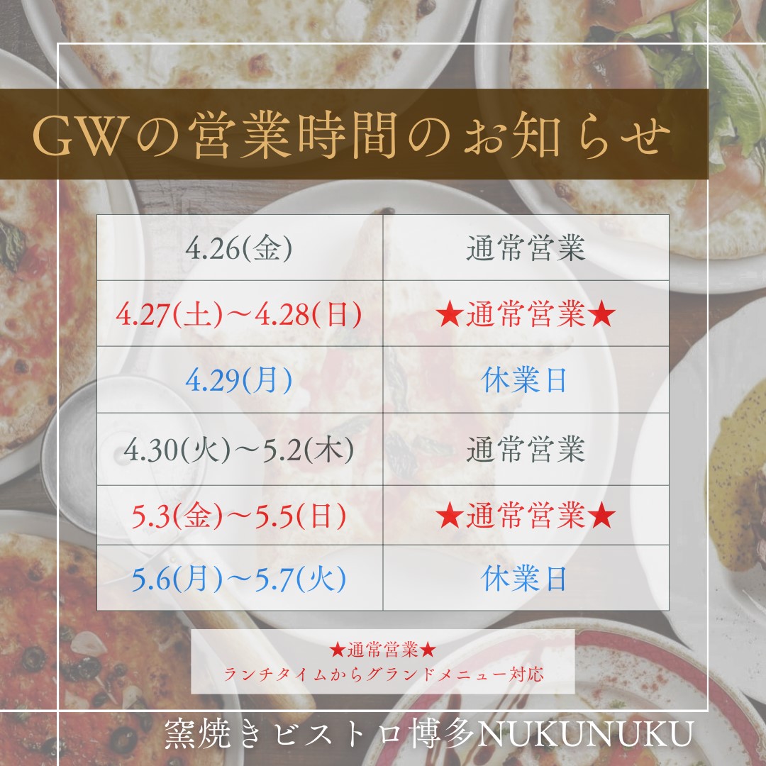 こんにちは! いつもご利用いただき、ありがとうございます。 ゴールデンウィーク期間の営業 についてのご案内です。 日時、ランチタイムの グランドメニュー対応について 画像の内容で営業させて いただきます☆ ゴールデンウィークのお食事、 ぜひビストロで過ごしませんか?(^^) 皆様のご来店 心よりお待ちしております!